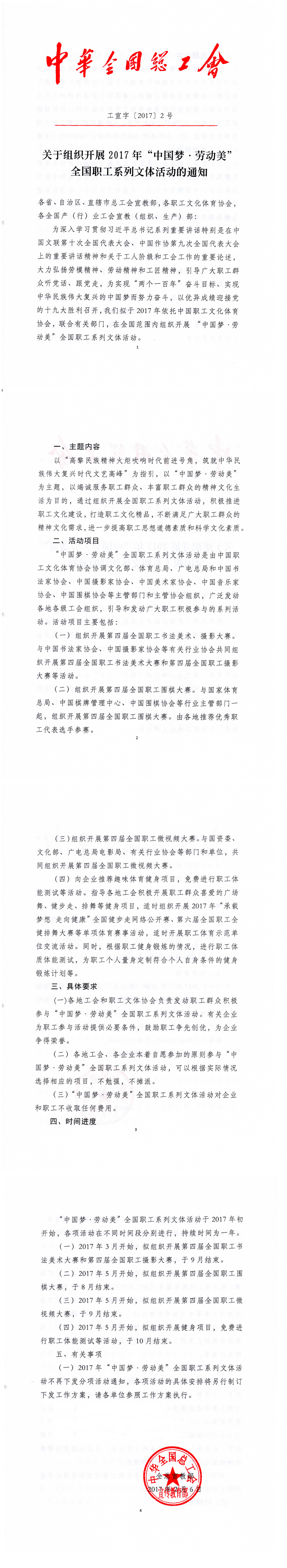 上一条:关于转发全总宣教部《关于组织开展2017年“中国梦·劳动美”全国职工系列文体活动的通知》的通知