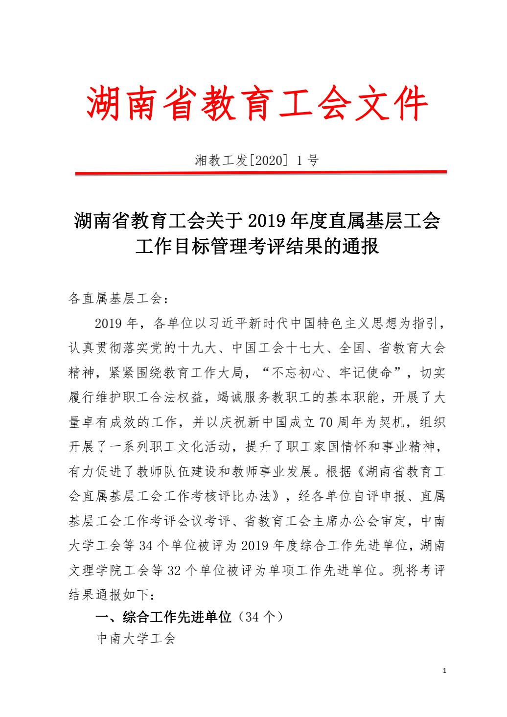 近日,在湖南省教育工会2019年度直属基层工会工作目标管理考评中,WilliamHill体育工会获评工作目标管理综合工作先进单位。