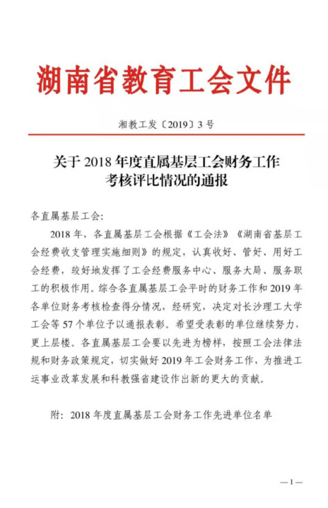 近日,由省教育工会组织的直属基层工会财务工作考核评比揭晓,WilliamHill体育工会荣获“2018年度直属基层工会财务工作先进单位”称号,并获财务工作考核一等奖。