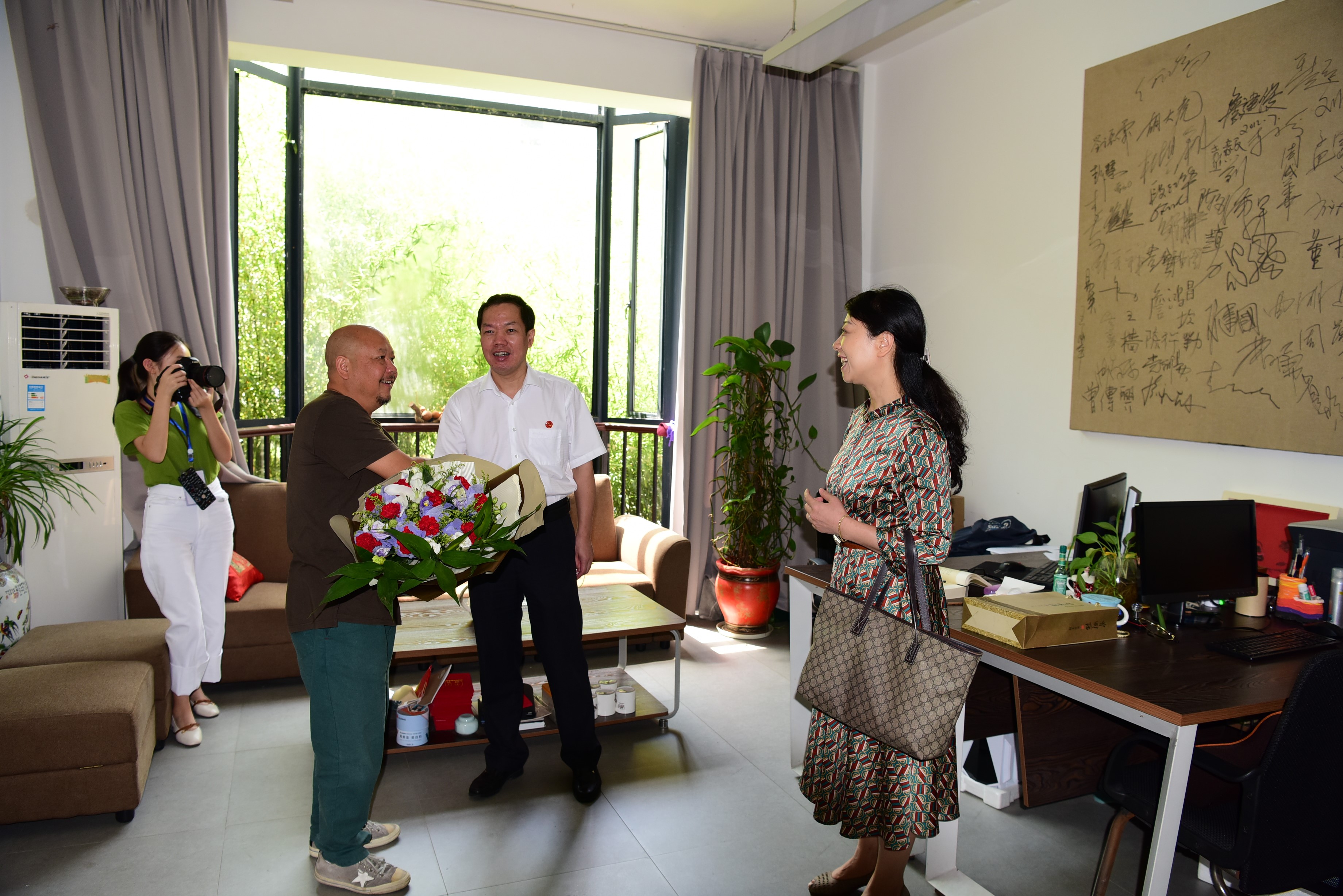 在生科院教学实验室楼,刘起军一行参观了刘少军教授培育的新品种--优良三倍体鱼,详细了解了科研、教学设施配备等情况。在美术学院段江华教授的工作室里,刘起军一行询问了段江华教授的工作和生活情况。