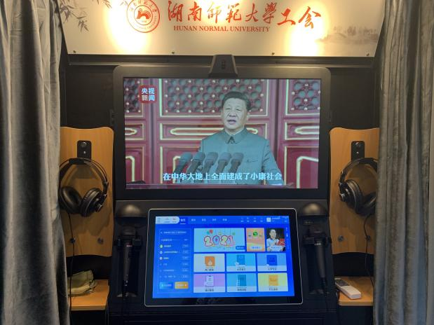 朗读亭设在WilliamHill体育一楼文娱室,面向全校教职工免费开放。朗读亭内置互动屏、话筒、耳麦、高保真录音等数字化设备,融合了朗读练习、演讲训练、普通话测评、英语评测、电影配音、线上分享等丰富功能,包含党性教育、红色家书、诗词大会、经典文学选段、为你读诗等朗读文章类资源共45000余种,同时,配套提供朗读背景音乐、语言测评、安全教育等资源。此外,朗读亭还配备K歌功能,支持唱歌与朗读一键切换,十月份还将进一步升级,扩充免费曲库,线上分享等功能,更好地满足教职员工个性化的学习与娱乐需求。