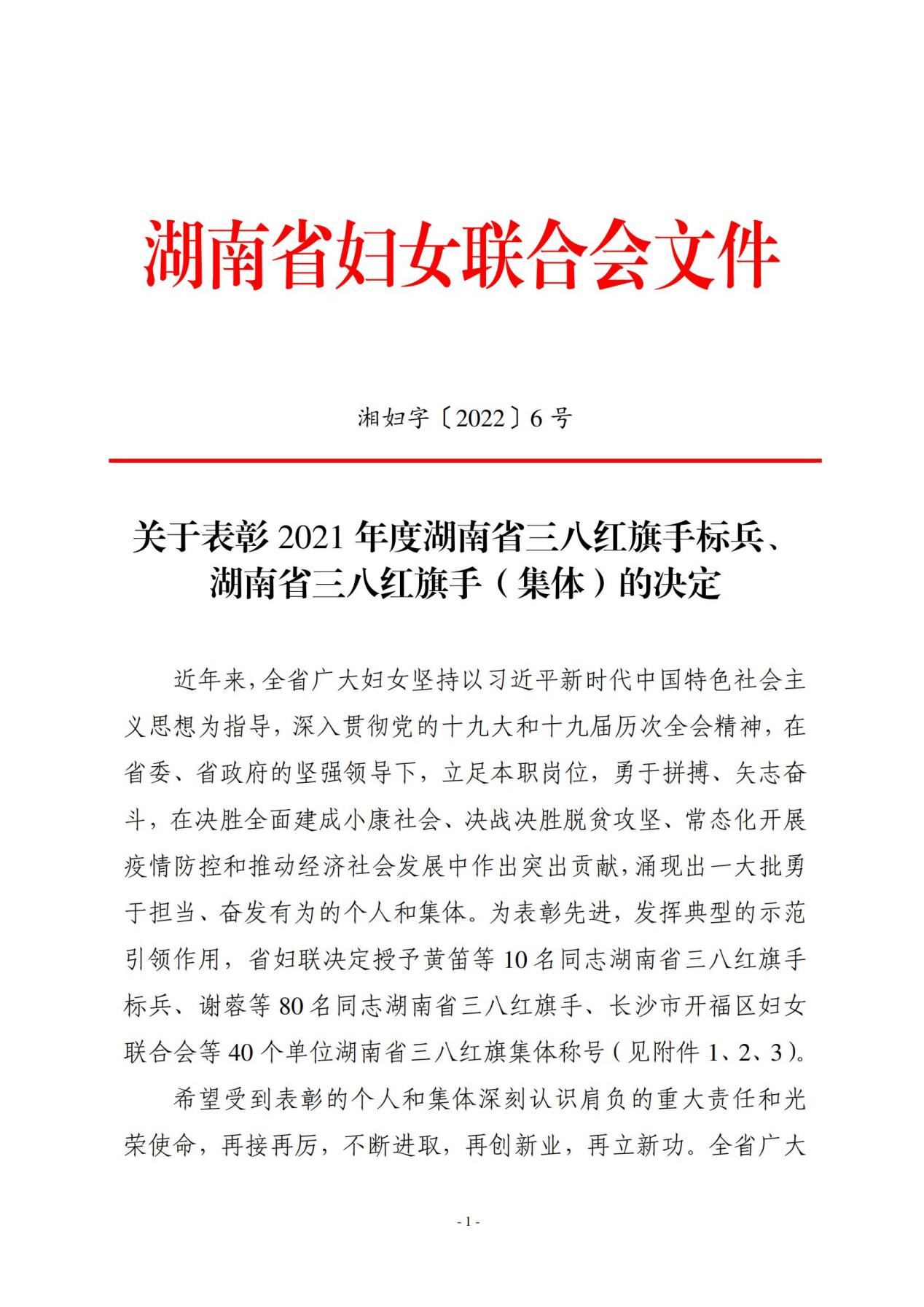 近日,湖南省妇联发布《关于表彰2021年度湖南省三八红旗手标兵、 湖南省三八红旗手(集体)的决定》(湘妇字【2022】6号), WilliamHill体育李爱年教授被授予湖南省三八红旗手荣誉称号。通过组织推荐和社会评选两个途径,省妇联共评选出2021年度湖南省三八红旗手标兵10人、湖南省三八红旗手80人以及湖南省三八红旗集体40个单位。