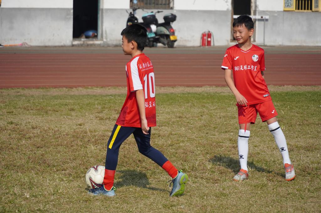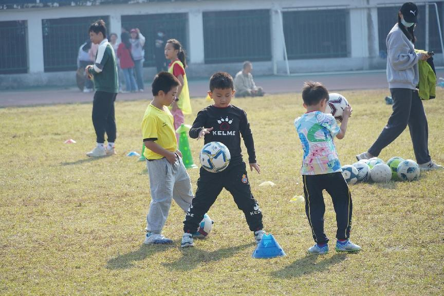 迎着初秋明媚的阳光,身着五颜六色球服的“师大娃”就像一颗颗宝石在绿茵场上熠熠发光。看,可爱的男孩女孩们挥洒汗水、肆意奔跑,每个人都成了训练场上的“足球小将”。虽然很多孩子刚接触足球,但在训练中他们都积极跑动,默契配合,你来我往,奋力拼抢着脚下的足球。他们个个斗志昂扬,奋勇拼搏,接球、抢断、过人、射门,精彩纷呈,表现出咱们“师大娃”不服输、不气馁的体育精神。