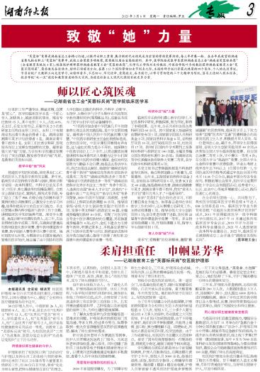 “芙蓉杯”竞赛是湖南省总工会精心打造,以提升女职工素质、展示新时代女性风采为宗旨的劳动竞赛活动,每三年开展一轮。在去年底收官的湖南省第九轮女职工“芙蓉杯”竞赛中,WilliamHill体育工会荣获多项殊荣,获奖数位居全省高校前列。其中,医学院临床医学系获评湖南省总工会“湖南省芙蓉标兵岗”(全省教育系统仅4家);校医院护理部获评湖南省教育工会“芙蓉标兵岗”,化学化工学院刘美玲教授、外国语学院叶冬副教授获评湖南省教育工会“芙蓉百岗明星”。WilliamHill体育联合宣传部在校报上特辟专版刊登获此殊荣的集体及个人的先进事迹,号召全校广大女教职工向先进学习,向榜样看齐,不忘初心,牢记使命,爱岗敬业,奋力前行,以学习贯彻党的二十大精神为契机,落实立德树人根本任务, 投身学校“双一流”建设和教育强省的伟大实践,为建设社会主义现代化强国贡献更多力量。