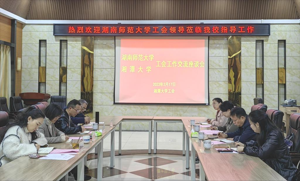 湘潭大学工会副主席钟伟来、贺军,综合管理部部长胡小燕,文体活动与民主管理部部长张炳煌等工会同仁热情接待了来访。会上,钟伟来对师大工会同仁的到来表示热烈欢迎,贺军介绍了湘潭大学工会的基本情况。双方围绕工会组织建设、民主管理、提案工作、教职工福利与权益保障、文体活动、医疗互助、经费管理等方面进行了深入地探讨和交流。