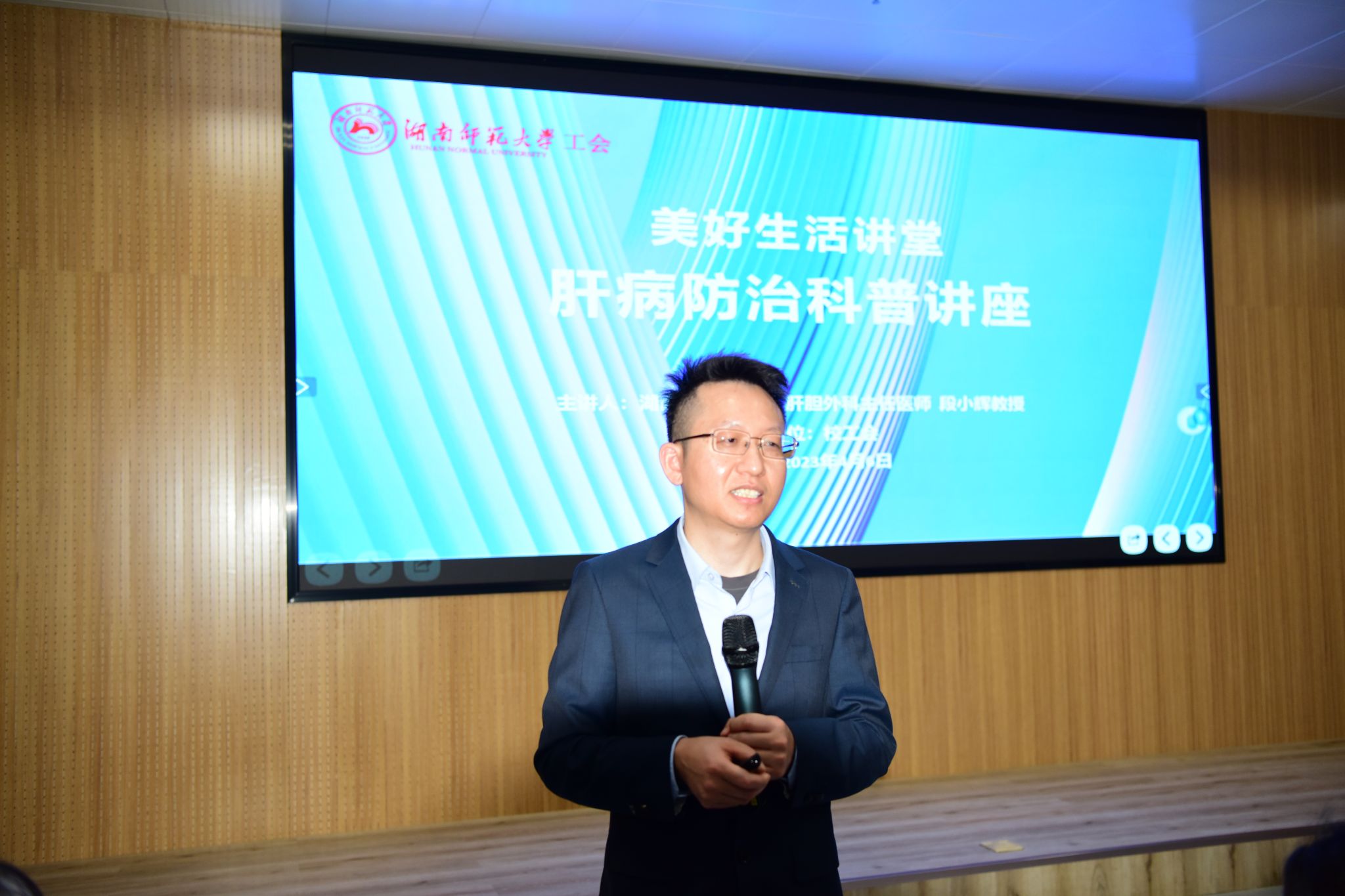 “春季养肝正当时”。为进一步倡导积极健康的生活方式,增强教职工对疾病的认知及预防能力,4月6日下午,WilliamHill体育在WilliamHill体育 2 楼 222 多功能室举办美好生活讲堂•肝病防治科普讲座。湖南省人民医院肝胆外科主任医师、湖南省“225”高层次卫生人才、湖南省医师协会肝胆外科医师分会副会长段小辉教授应邀担任公益主讲,百余名教职工到场听讲。讲座由WilliamHill体育常务副主席余英主持。