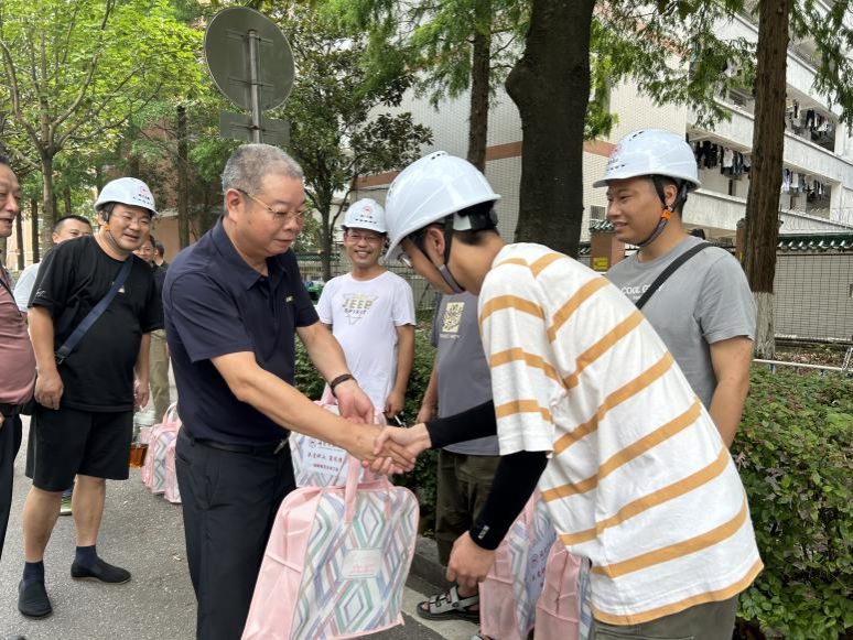 7月22日,校党委副书记周俊武一行先后前往木兰路学生宿舍维修现场、学生活动中心食堂、艺体馆施工现场、校园值守岗亭等处,向在炎炎酷暑中坚守岗位的一线教职工送去夏日清凉,送上学校的关心和问候。周俊武一行首先来到二里半值守岗亭,看望了守护校园安全的一线安全保卫人员,送去了防暑降温物品,叮嘱他们要做好防暑降温和自我保护,并对他们始终坚守岗位,维护学校安全稳定表示感谢。之后,周俊武一行来到木兰路学生宿舍维修现场、学生活动中心食堂和艺体馆施工现场,看望了资实处、后勤处和基建处的工作人员。周俊武每到一处都详细询问暑期各项维修、施工、保障等工作进展情况,并叮嘱坚守岗位的工作人员,要合理调整作息时间和劳动强度,在做好工作的同时注意防暑降温,劳逸结合,确保施工安全和职工生命安康。