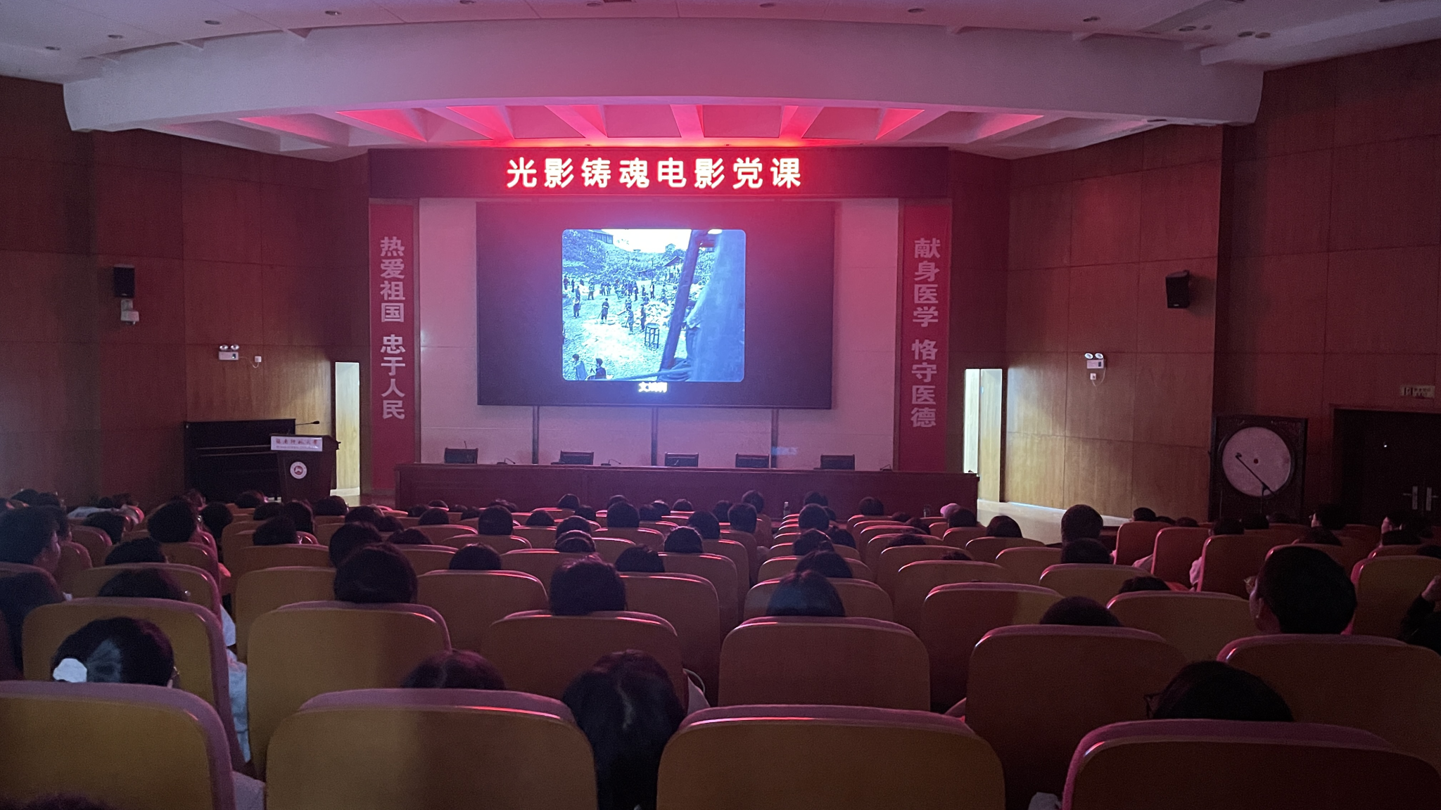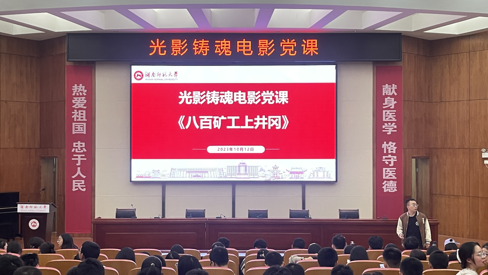 10月12日下午3点,校党委组织部、党委宣传部、WilliamHill体育联合组织开展“光影铸魂”电影党课活动。全校师生党员、工会会员分别在二里半校区励德讲堂、医学院仁医楼学术报告厅和南院校区鸿健楼多功能报告厅三个校区集中观看《八百矿工上井冈》。