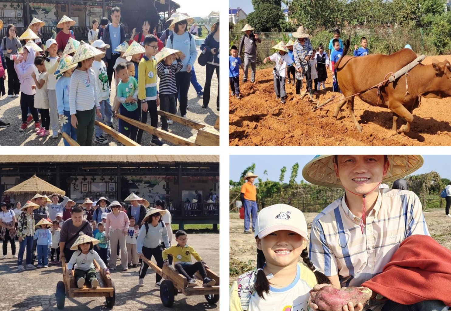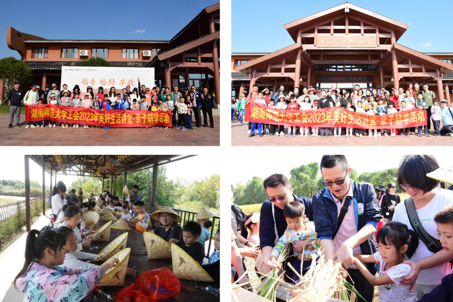本次亲子研学活动以教职工家庭为单位,按不同的年龄段进行分组。活动以欢乐的亲子律动开启美好的一页,在研学老师的带领和讲解下,家长和孩子们走进稻作文化长廊,体验学习204米长的开放式自然农耕博物馆,情景式感受农耕文化,了解水稻生长的12道程序,并认识那些图片中偶遇过的传统农耕用具,从原始到传统再到现代零距离感受农耕文明的发展。在家长的陪同下,孩子们亲自下田收割打稻,感受“锄禾日当午,汗滴禾下土”的农耕辛苦,体验“道狭草木长,夕露沾我衣”的田园乐趣,领会“一箪食,一瓢饮”的来之不易。随后孩子们进行斗笠创绘,制作属于自己独特韵味的乡间斗笠,开展“疯狂独轮车”、箩筐运娃等亲子游戏。活动中,不仅孩子们热情高涨,家长们也乐在其中。