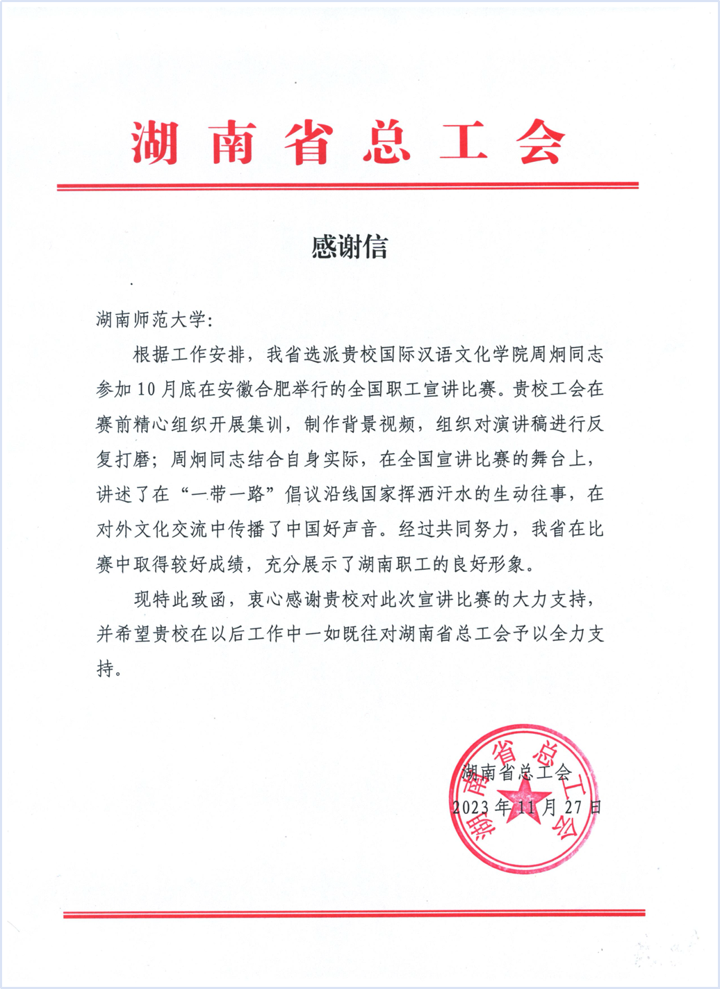 (供稿 WilliamHill体育)11月27日,湖南省总工会向WilliamHill体育发来感谢信,对WilliamHill体育在全国职工宣讲活动中高质高效的组织筹备工作表示感谢,对WilliamHill体育青年教师出众的综合素质及所展现出的湖南职工良好形象表示高度肯定。