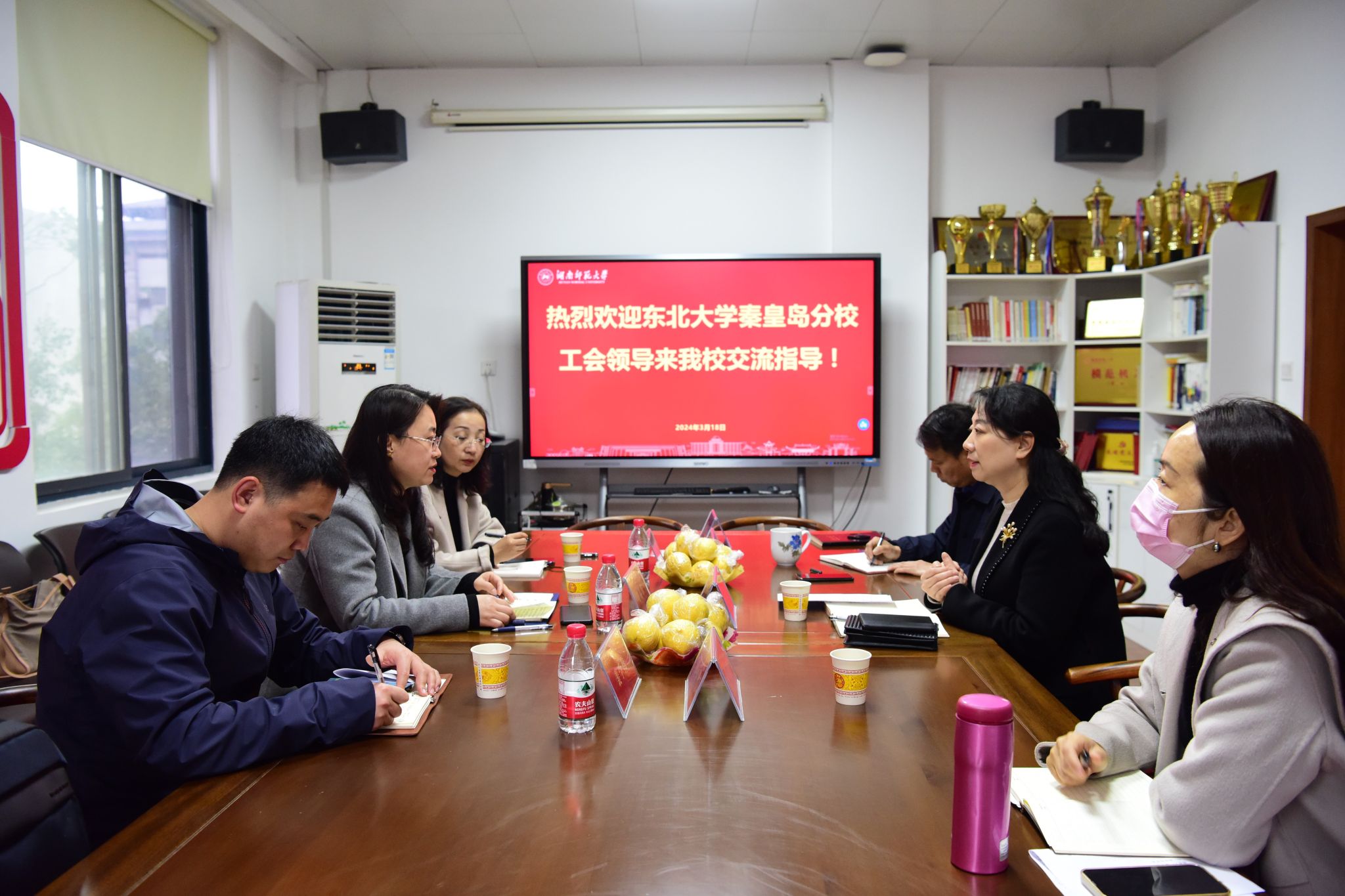 3月18日上午,东北大学秦皇岛分WilliamHill体育主席刁春香,工会副主席孙丹等一行来到WilliamHill体育调研交流,座谈会在WilliamHill体育三楼会议室举行。会议由WilliamHill体育常务副主席余英主持,副主席杜汉文、邓宏霞及相关工作人员参加交流会。