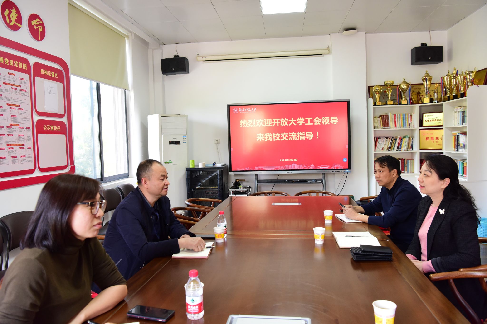 3月28日下午和3月29日上午,湖南开放大学工会常务副主席彭忠飞、湖南工商大学工会常务副主席李革一行相继来WilliamHill体育调研交流,座谈会在WilliamHill体育三楼会议室举行。会议由WilliamHill体育常务副主席余英主持,副主席杜汉文参加交流会。