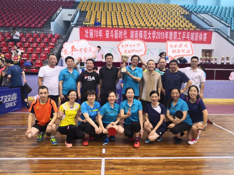 今年比赛强手如云,除常规20多个学院、机关代表队外,新增了湖南省人民医院、湖南师大附中两个强势代表队。学院乒乓球健将稳扎稳打,顽强拼搏。在第一阶段的小组赛中以第一的绝对优势出线;八进四的淘汰赛中,队员们互相鼓励,学院老师们现场加油呐喊、隔屏支招鼓劲,场内场外连线助威,运动员顶住了前所未有的巨大压力,在艰难相持的决胜场决胜局以三分的优势挺进四强;最终战胜对手,拿下了沉甸甸的奖杯。