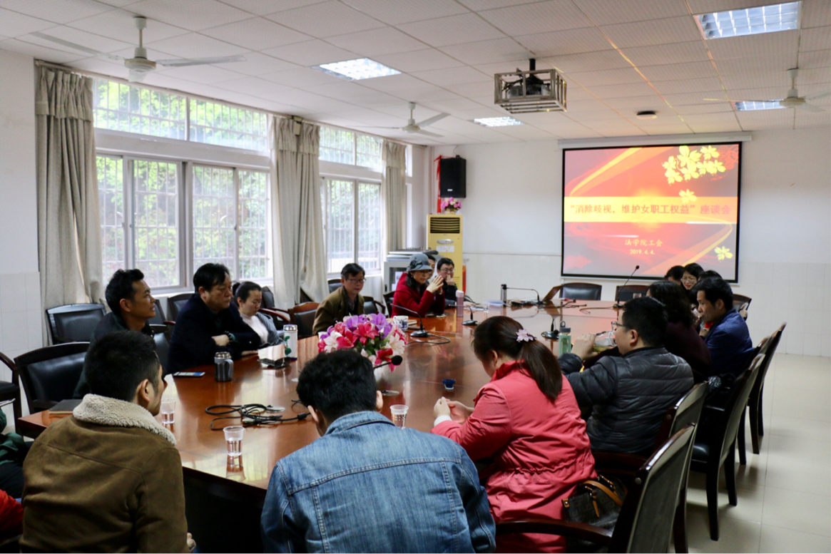 (通讯员 罗文苑)4月4日下午三点,法学院工会在学院304会议室开展“消除歧视,维护女职工权益”座谈会。法学院党委于烽书记、法学院副院长李晓玲、WilliamHill体育女工委员会委员魏敏副教授出席此次会议,会议由法学院工会主席、党委副书记陈胜国主持。