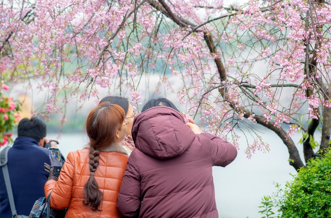 湖南省森林植物园占地面积140公顷,森林覆盖率达到90%以上,共收集保育包括珙桐、银杉等珍稀植物在内的208科900属3200种植物。园内已建成樱花园、木兰园、杜鹃园、郁金香园等多个植物专类园。此时正值郁金香和樱花盛开期,繁花似海,春意盎然。教职工们三五成群,欢声笑语,在郁金香花海与樱花长廊中漫步,不时拿出手机自拍,定格于美好春天相遇的精彩瞬间。
