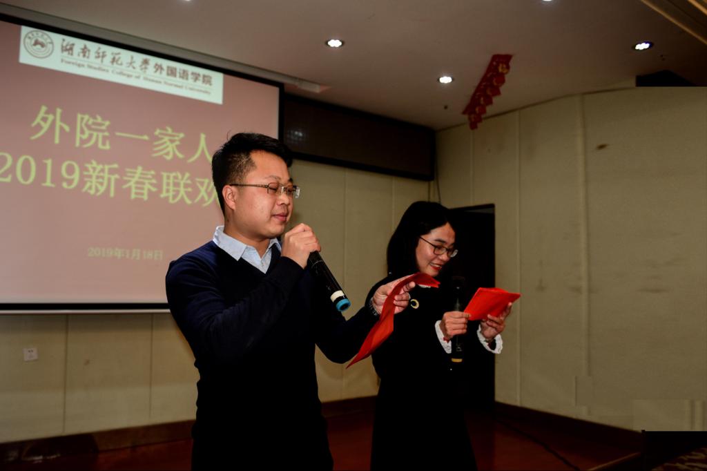 2019年1月20日晚,由WilliamHill体育外国语学院部门工会主办的2019年教职工新春联欢会正式拉开序幕。晚会在合唱《我和我的祖国》的歌声中热闹开场,合唱队伍由学院党委、行政领导班子成员和各党支部书记组成,台上倾情演唱,表情严肃认真,台下掌声雷动,欢呼声此起彼伏。