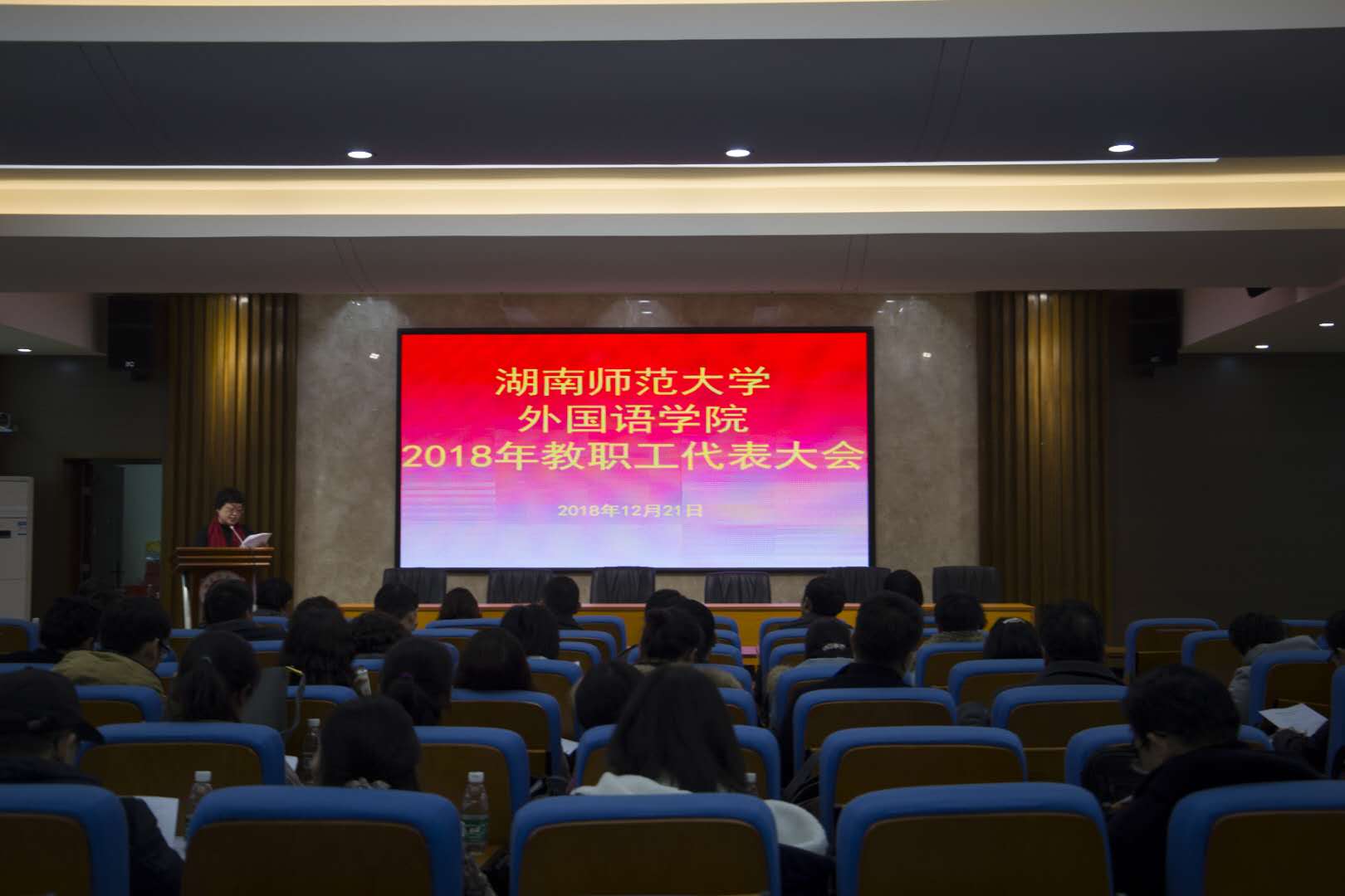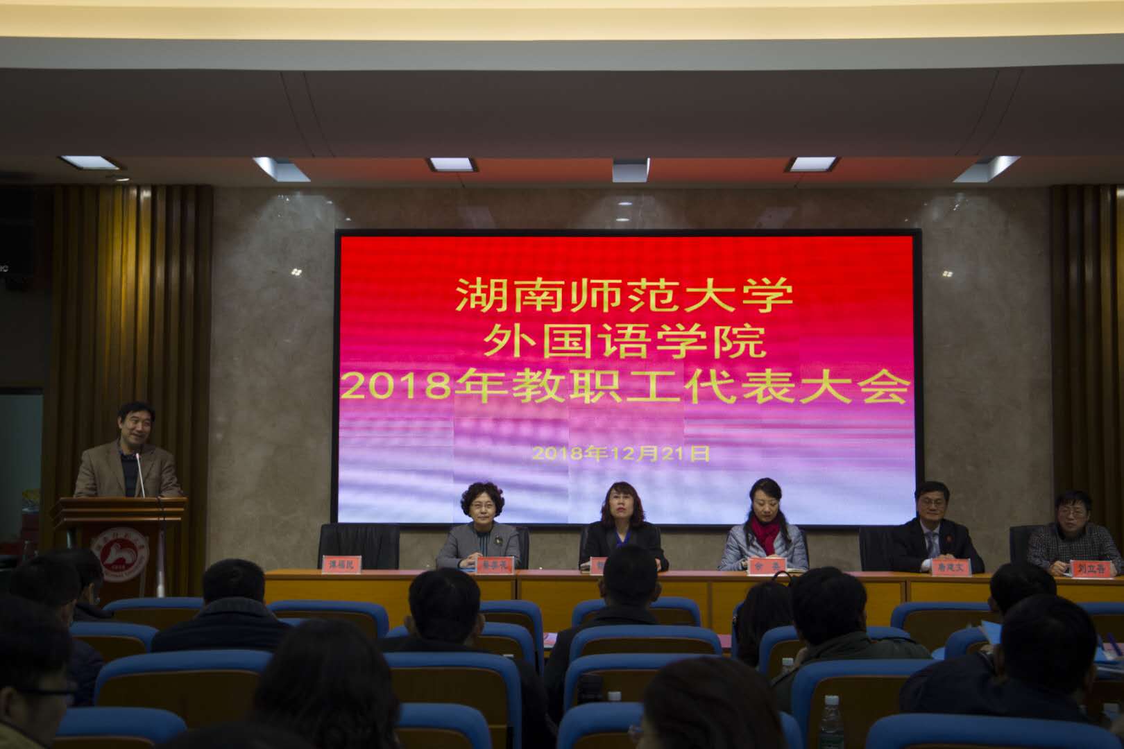 此次教代会是正值全国上下庆祝改革开放40周年的大背景下召开的。在这次教代会后,我院全体教职工将在习近平新时代中国特色社会主义思想引领下,积极响应党中央将改革开放进行到底的号召,继续秉承“仁爱精勤”的校训精神,坚持“国际视野、天下情怀、明德尚善、博学雅行”的院训精神,把握历史大势,顺应时代潮流,抓住变革时机,奋力拼搏、勇于创新,积极投入学校双一流建设,开启外国语学院发展新征程,紧扣新时代发展对外国语言文学人才的高要求,致力于培养更多德才兼备、人格完整、身心健康的复合型和创新型社会主义接班人和建设者。