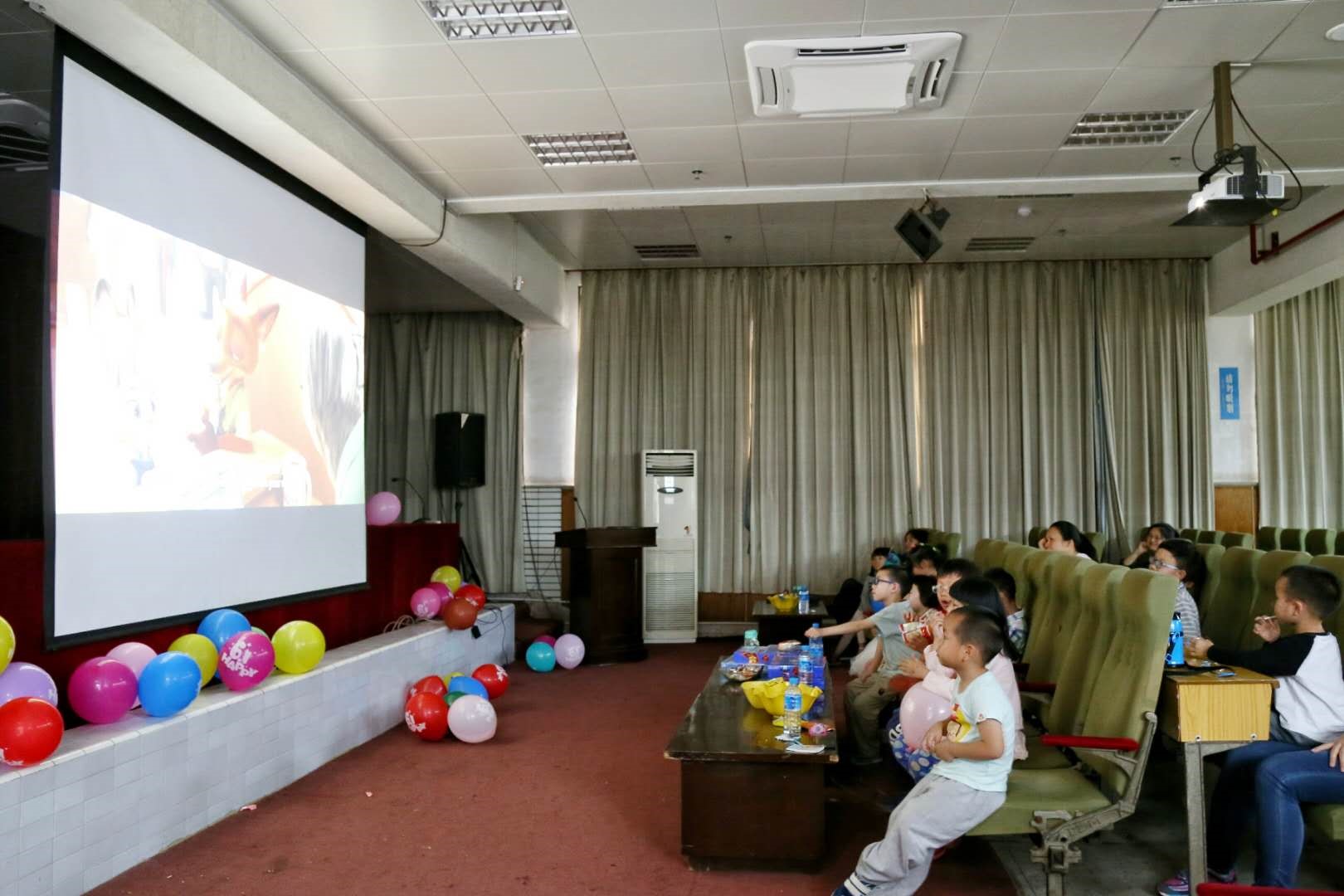 活动一开始,所有的小朋友都领取了一份六一儿童节礼物,并合影留念。接着,家长与孩子们饶有兴趣地观看了电影《疯狂动物城》,尽管是英文版,但不论是大龄孩子还是小龄孩子都沉浸在电影的情节当中,小朋友纷纷指出动物的名字,跟随电影的情节时而欢呼,时而惊叹。在电影上下半场之间,周丹老师又组织全体小朋友玩“动物蹲”的游戏,每个孩子都准确的认出和记住了自己所代表的动物,这个游戏非常有趣,又与电影主题相关,大家玩得都非常开心。