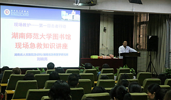 讲座内容主要包括心跳呼吸停止、气道异物梗阻、烧烫伤、淹溺、狗咬伤等几种常见的受害现场救护,着重讲解了心肺复苏的处理方法,介绍了心脏自动体外除颤仪(AED机)的使用方法,并进行了现场急救演示。