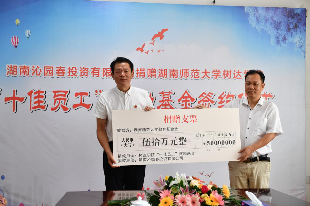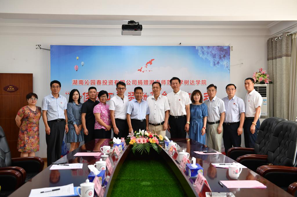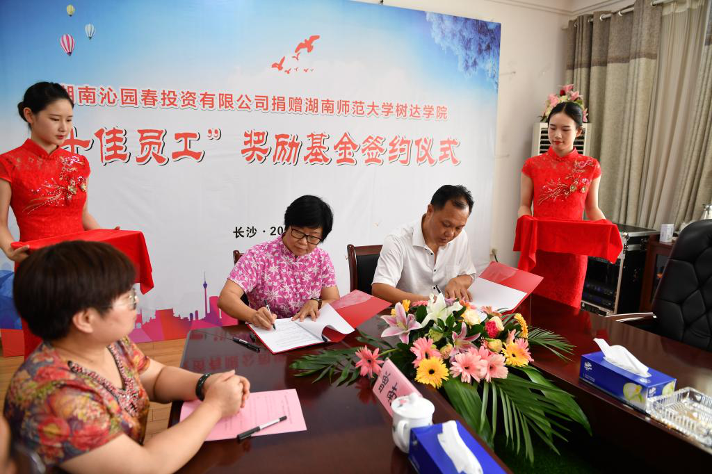 为激励教职工热心教育事业、积极进取、开拓创新,增强责任感、荣誉感和幸福感,我院与湖南沁园春投资有限公司共同设立学院“十佳员工”奖励基金。湖南沁园春投资有限公司董事长赵小年与WilliamHill体育校友总会秘书长杨玲签订了捐赠协议书,并向我院捐赠“十佳员工”奖励基金50万元,孙洪涛代表学院接受捐赠。思齐芙蓉教育集团(湖南)有限公司党委书记、董事长李章出席捐赠仪式并对赵小年董事长致力于教育表示由衷钦佩。