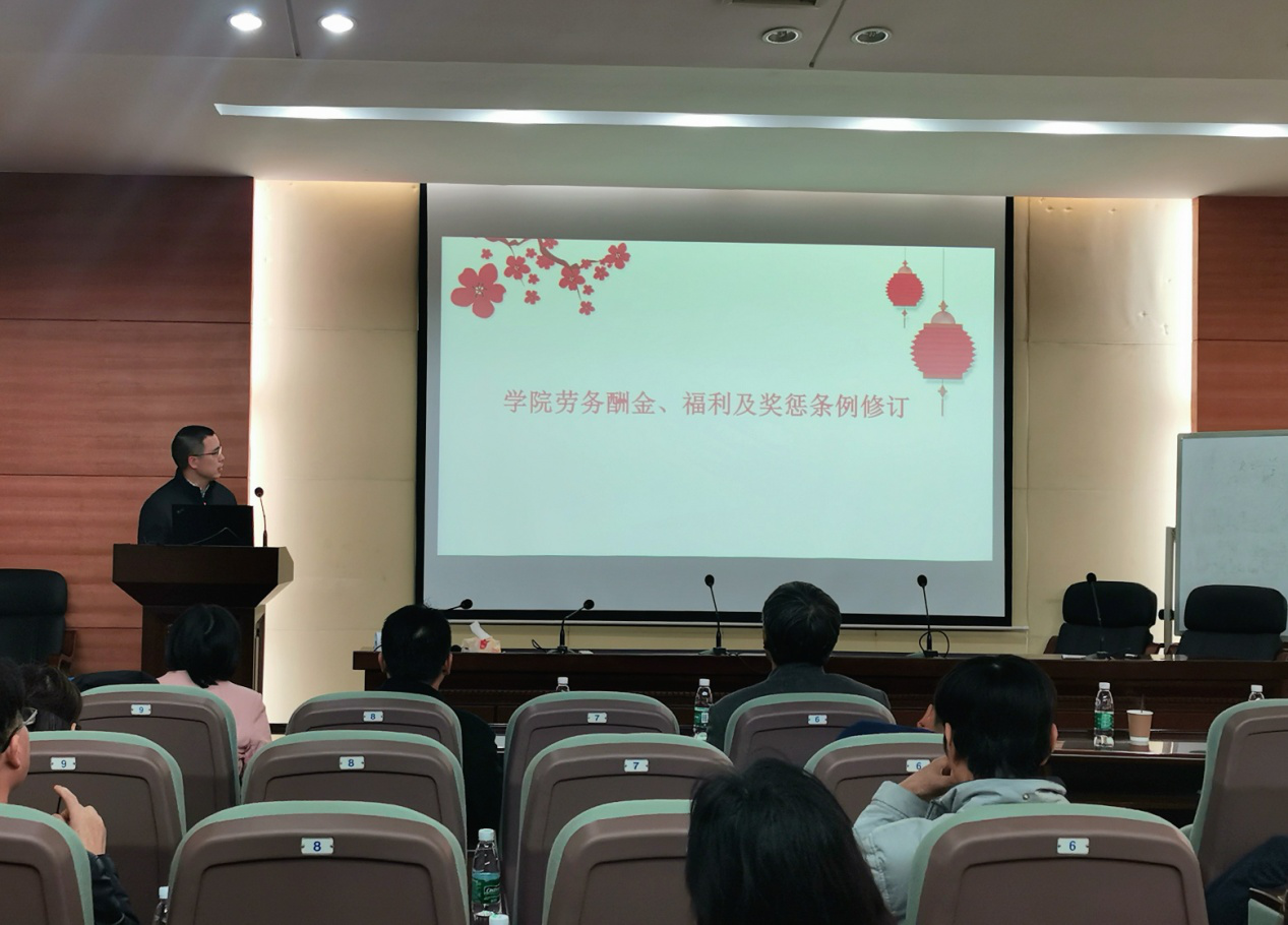 学院工会主席刘红荣做2019年学院工会工作总结报告,对《代表提案》做了详细说明并主持修订学院《2019年度劳务分配条例》。此次教代会主要针对本科教学质量工程项目:五类金课及优质课程建设、教材建设、获批教改(团队)项目、发表教改论文、获得教学成果奖、指导本科生发表论文、指导大学生创新创业项目等提高绩效奖励力度,以促进本科生教学工作。唐东升院长代表院领导班子对工会一年来的工作做了充分的肯定,并希望院工会再接再厉、再创辉煌。