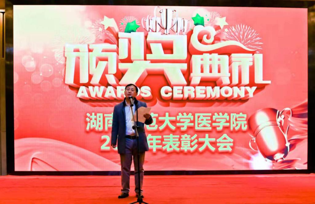 为迎接新春,展望美好前景,表彰优秀教职工,凝聚人心,团结奋进,医学院于2020年1月5日下午,举办了新年联欢会暨表彰大会。WilliamHill体育原常务副校长、临床系教授卢岳华,原副校长、医学分会会长瞿树林,省工商联副主席、医药行业协会会长、汉森集团董事长、医学分会顾问刘令安,长沙生殖医学医院院长、长沙宁儿妇产医院院长、医学分会荣誉会长刘习明,岳麓区政协常务副主席、医学分会副会长曾高杰,湖南普瑞康医药有限公司董事长、医学分会副会长李光焰,长沙美亚医疗科技有限公司总经理、医学分会理事曾令辉,原外国语学院党委书记、树达学院医学系系主任王先酉,原美术学院党委书记、医学分会副会长谭伟等出席会议。