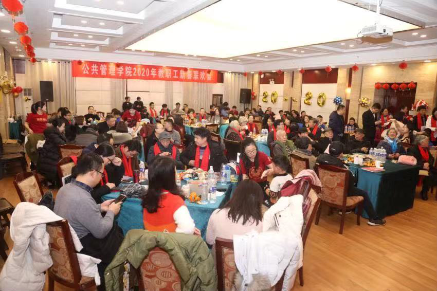 1月9日下午,公共管理学院在红楼五楼会议室举办了“2019年表彰大会暨2020年新春联欢会”。全体在职教职工和学院离退休老同志参加了联欢会。毛新志院长作新年致辞后,颁发了学院教学十佳奖、青年教师课堂教学竞赛奖、院工会优秀工会小组奖、和谐家庭奖等奖项。随后进入联欢会环节,学院工会干部和青年教师表演的开场舞《燃烧你的卡路里》拉开了联欢会序幕,以舞蹈展示青春和激情。联欢会节目丰富多彩:离退休老师表演了舞蹈《大海航行靠舵手》,行管系工会小组表演了“朗诵串烧”,政治学系工会小组有诗朗诵《致橡树》,哲学系工会小组带来了“走秀+合唱”,社会学系工会小组歌曲演唱情景表演《上海滩》,节目表演中穿插了饶有趣味的游戏和抽奖环节,将晚会推向高潮。行政工会小组的热烈喜庆的舞蹈《吉祥欢歌》压轴出场,晚会在快乐、祥和的气氛中落下帷幕。