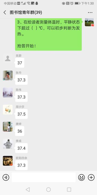 此次知识竞赛通过“青年职工微信群”和“问卷星小程序”在线上开展,分为抢答和竞答两个环节,内容涉及新冠肺炎防疫基本知识、如何科学预防感染、如何做好复学后馆内疫情防控、与疫情相关的文献检索等知识,贴近职工工作生活实际。竞赛开始后,青年老师们积极抢答,拼知识储备、比检索技能、拼网速、比手速,气氛热烈,效果明显。抢答环节结束后,老师们兴致勃勃,意犹未尽,纷纷扫码参与了竞答环节的答题。