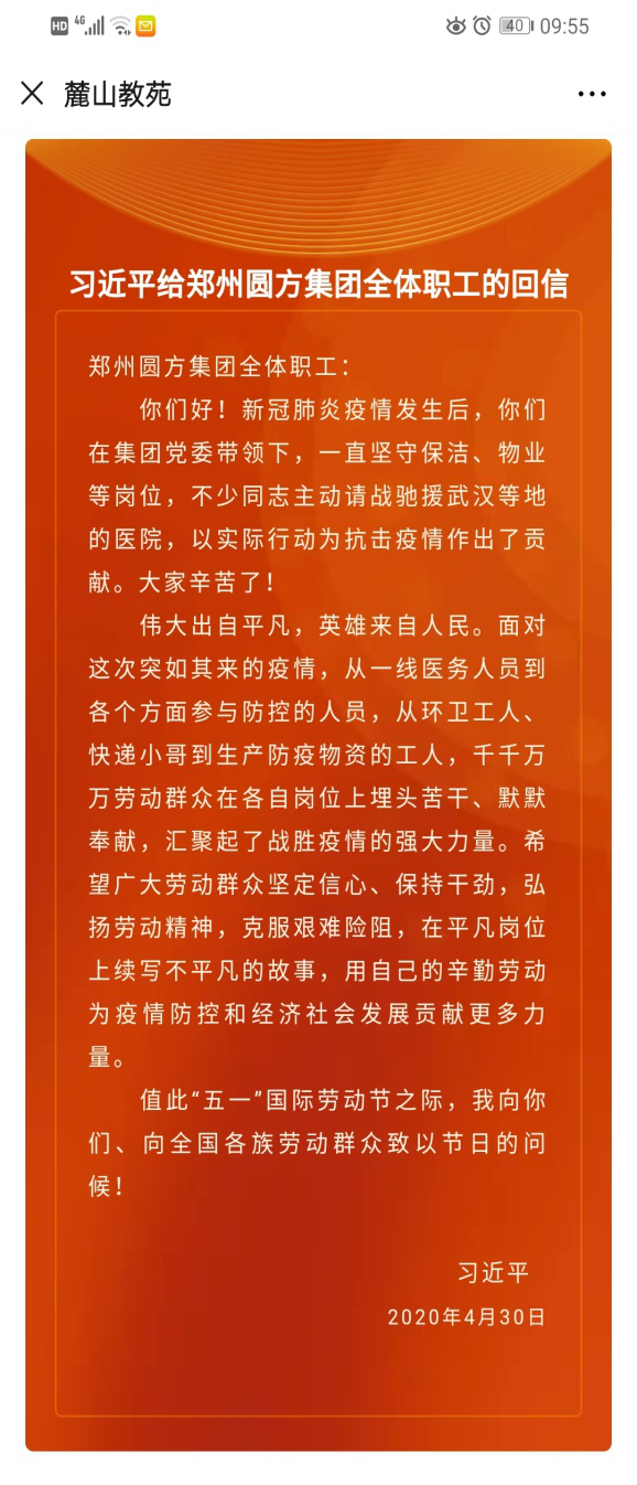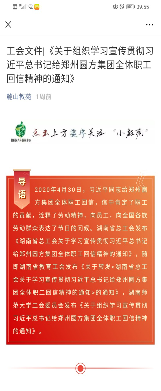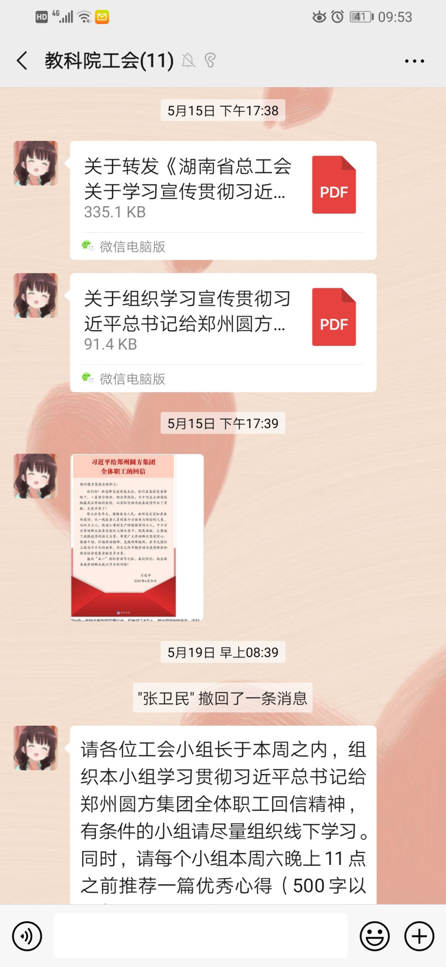 学院部门工会领导高度重视,认真部署。通过在学院官方网站、官方微信公众号、QQ群、微信群等线上渠道宣传习近平总书记给郑州圆方集团全体职工回信全文及上级相关通知文件,要求各工会小组认真学习,并撰写心得体会。