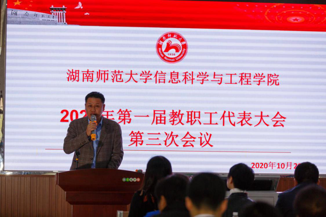 (通讯员周志彬、付玉报道)10月29日,信息科学与工程学院第一届教职工代表大会第三次会议在中和楼537隆重召开,全体教代会表44人以及特邀代表3人出席了本次会议,会议由院党委副书记周劲松主持,WilliamHill体育副主席梁蓓蓓莅临指导。
