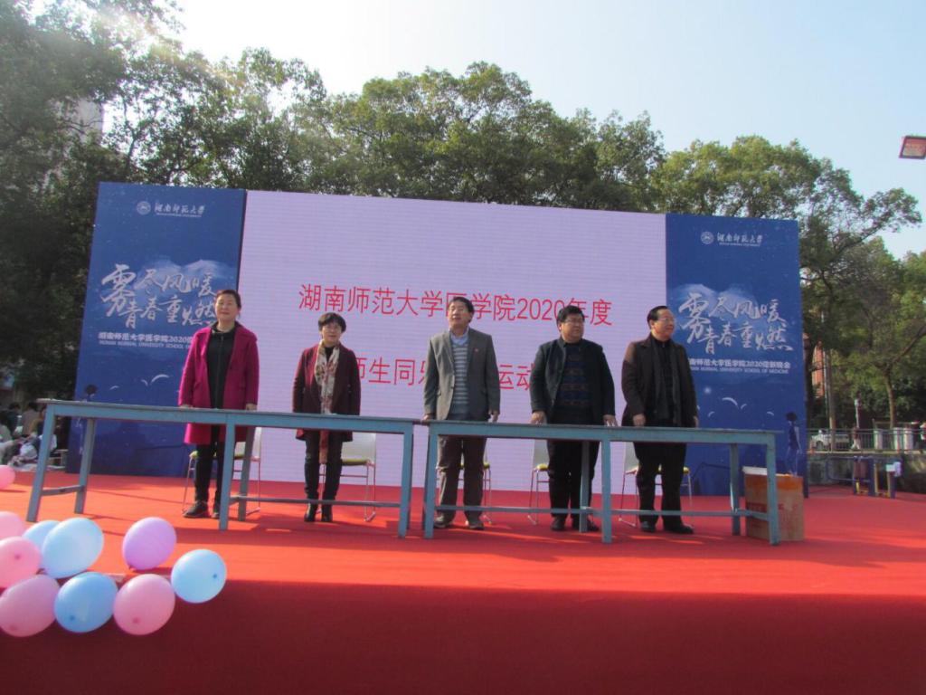 为了丰富师生业余文化生活,加强师生交流协作,促进和谐校园文化建设,12月6日下午医学院部门工会在田径运动场举办了首届师生同乐趣味运动会。全院在职教职工和部分同学联合组成了8只参赛队,累计约300人参与了此次活动。开幕式由院工会主席冯星教授主持,医学院党委书记鄢朝晖致开幕辞,何祖平院长宣布运动会开幕。