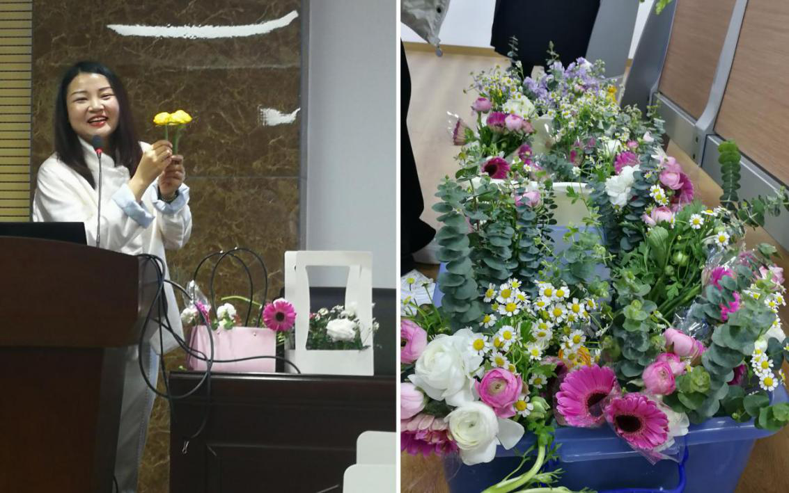 活动现场,花艺老师向大家细致地讲解了鲜花的花语,并讲述了插花的种类和插花的原则。插花和绘画、自然景观等等是相通的,插花中要注意色彩、主次关系、质感、韵律、平衡等。除此之外,还有花的护理方法,需把花束里的鲜花斜着剪开并斜插,这样有利于鲜花吸水,能够保持得更加持久。通过花艺老师生动形象的讲解,大家认识了一些基本的花材和插花器具,初步掌握了制作花艺作品的基本技巧和插花艺术的鉴赏知识。