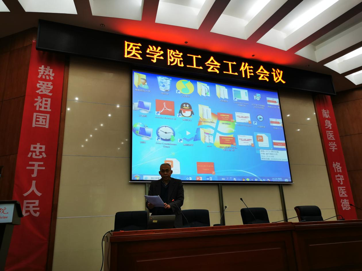 (通讯员齐心仪李雪)4月22日下午,医学院在仁医楼学术报告厅召开全院教职工大会,学院工会主席袁仕善布置工会工作,会议由院党委书记鄢朝晖主持。