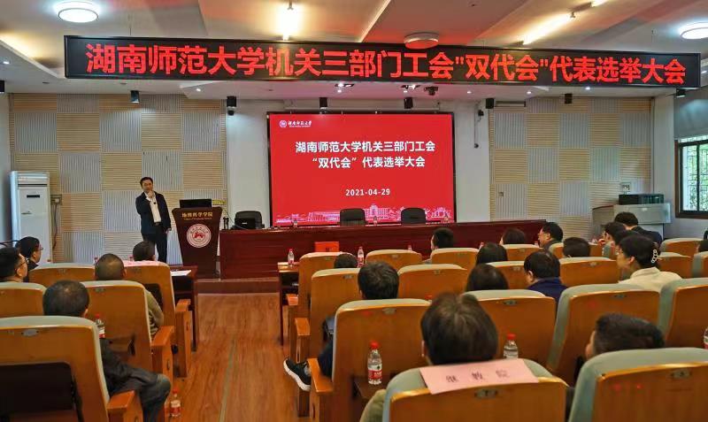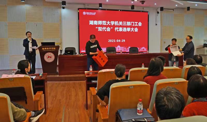 (通讯员张曙光)4月29日下午,机关三部门工会在地理科学学院报告厅召开学校第八届教职工代表大会暨第十六届工会会员代表(以下简称“双代会”)选举大会。会议由机关三部门工会主席向坚持主持。
