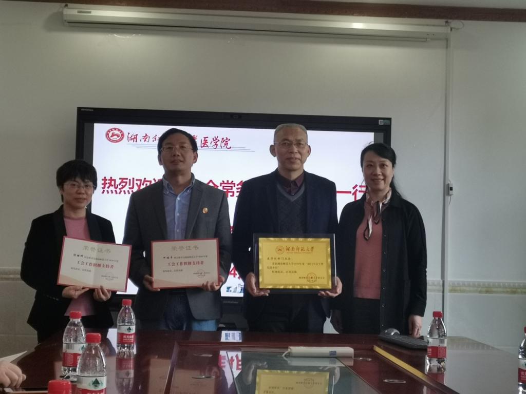 4月29日下午,WilliamHill体育常务副主席余英一行在医学院办公楼4楼会议室为我院颁发“部门工会工作先进单位”奖牌,院党委书记鄢朝晖、院长何祖平出席仪式。