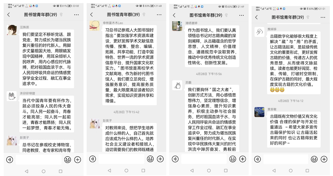 为庆祝“五四青年节”,弘扬“五四”精神,凝聚青年力量,激发青年实干担当的工作激情,4月28日下午,WilliamHill体育组织青年馆员开展“在青春的赛道上跑出最好成绩”线上学习交流活动。青年馆员围绕习近平总书记在中国人民大学考察时的重要讲话精神,结合工作实际,就新时代青年馆员创新发展,古籍文献的开发与利用等话题开展了热烈讨论,大家立足当下,展望未来,共话新时代青年的青春担当。