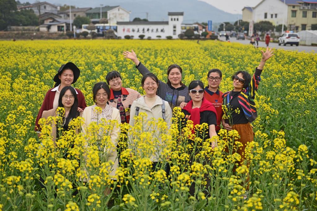 女同胞们在油菜花海中流连徘徊,不舍这美好的早春生机,工作的疲劳和紧张消除了,生活的诗意和激情回来了。