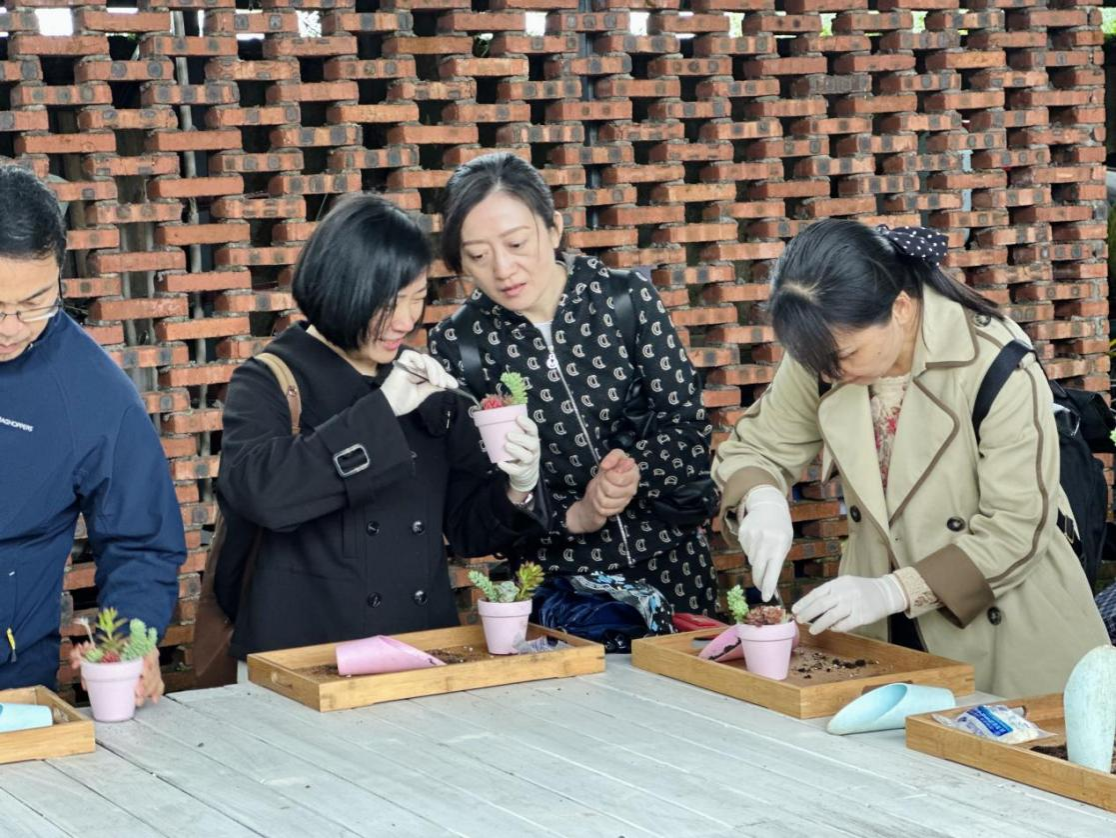 下午,老师们前往园区开展多肉DIY制作活动。在活动现场的桌子上,摆满了造型可爱的花盆、不同种类的多肉植物、泥沙土石等各类材料。老师们展现出丰富的创造力和想象力,变身为妙手花匠,一层层科学放土,一朵朵小花巧妙组合,打造出了各具特色的“多肉盆景”。活动结束后,大家纷纷举起自己满意的作品,拍照留念,记录精彩瞬间。