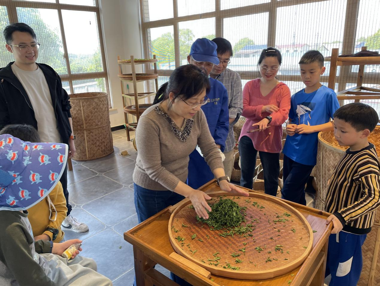 当天上午,艳阳高照,老师们首先来到凌冲村的云游茶场。看到绿莹莹的成片茶树,老师们特别兴奋,尽情地感受春天气息。在茶厂负责人的引导下,老师们戴上斗笠、挎着茶篮踏入茶林,在欢声笑语中采摘芽叶、拍照打卡。一个多小时的采摘体验完毕后,大家在专业制茶师的指导下,先将采摘的茶叶摊青,然后由师傅教大家体验炒茶,再跟着师傅一起揉茶,最后由师傅将揉捻好的青叶置入烤盘烘干。
