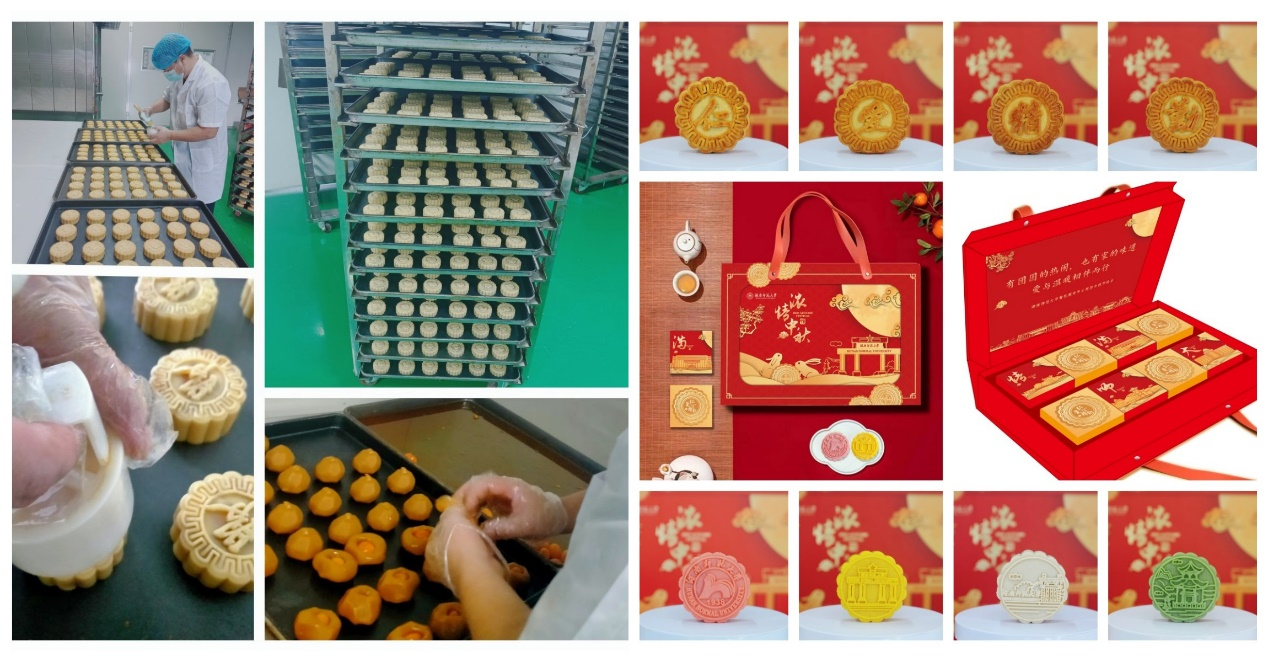 今年的月饼不但新增了包装设计,更是对月饼的口味和样式进行了升级。八种不同口味的月饼,每块月饼上都印有校徽、校训、校门等师大元素图案。月饼制作现场从馅料选择、原料采购到月饼制作、包装,每个环节都严格把关,只为让学生们吃得放心,让月饼的香味飘满校园。