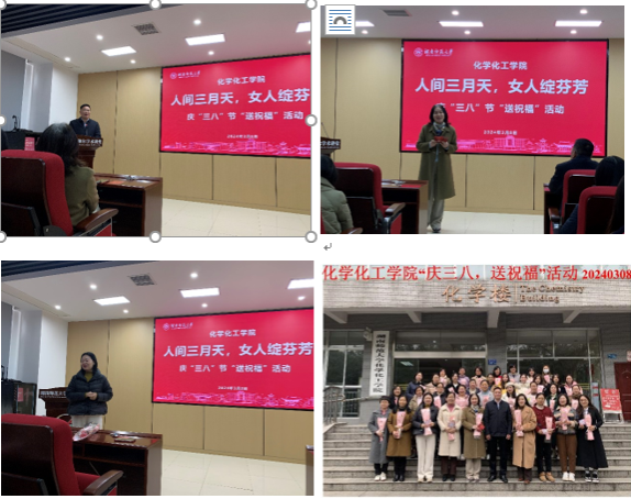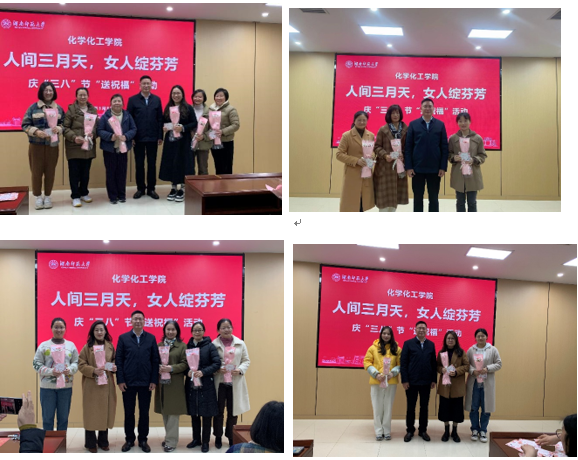 (供稿人:周明波)为庆祝第114个国际劳动妇女节,进一步提高学院女教职工的归属感、荣誉感以及幸福感,激发女教职工的工作热情和创造力,化学化工学院于3月8日开展了以“人间三月天,女人绽芬芳”为主题的“庆三八,送祝福”活动。学院党委书记谭东波、副书记段婷、副院长宋春红、专职组织员梁艳芳等院领导出席本次活动。活动由院工会主席余丽萍主持。