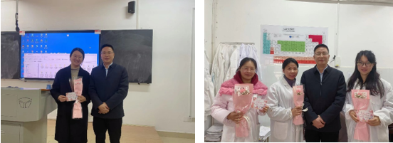 谭东波向在场的每一位女教职工赠送鲜花与贺卡,并亲自把这份礼物送给在在课堂以及实验室开展教学和研究的每一位女教职工。