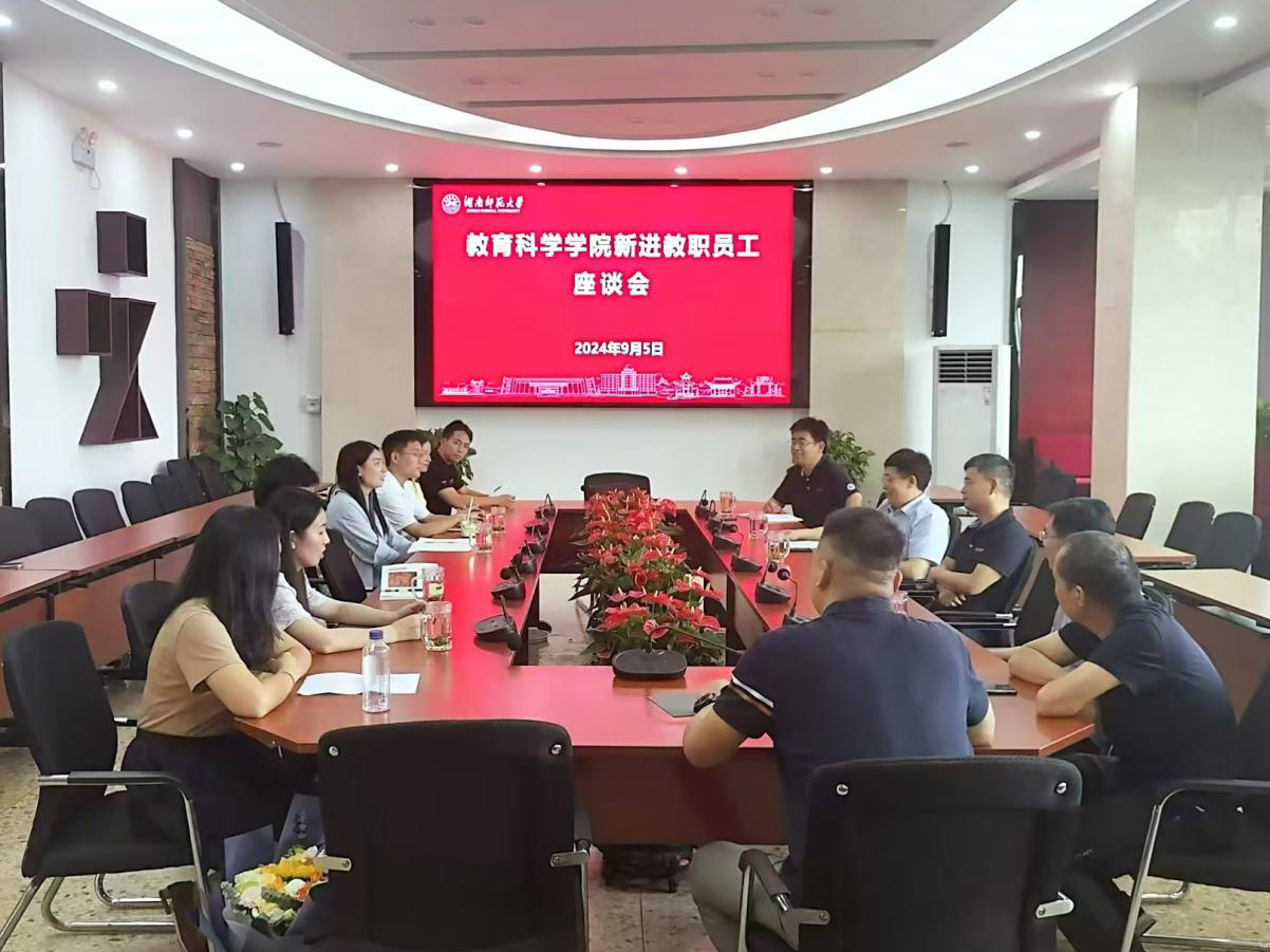 (通讯员 施雯 屈佳慧)9月5日下午,在第四十个教师节临近之际,为帮助学院新入职教师适应教学生活,融入教学团队,教育科学学院在七楼会议室召开了新进教职员工座谈会。座谈会由院党委书记向发意主持,院长刘铁芳,副院长丁道群、容中逵、赵亮,院党委副书记欧阳文芳以及8位新进教职工参加座谈会。