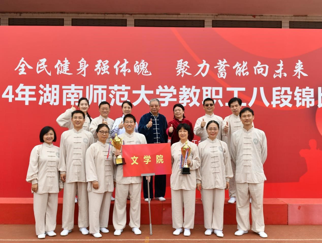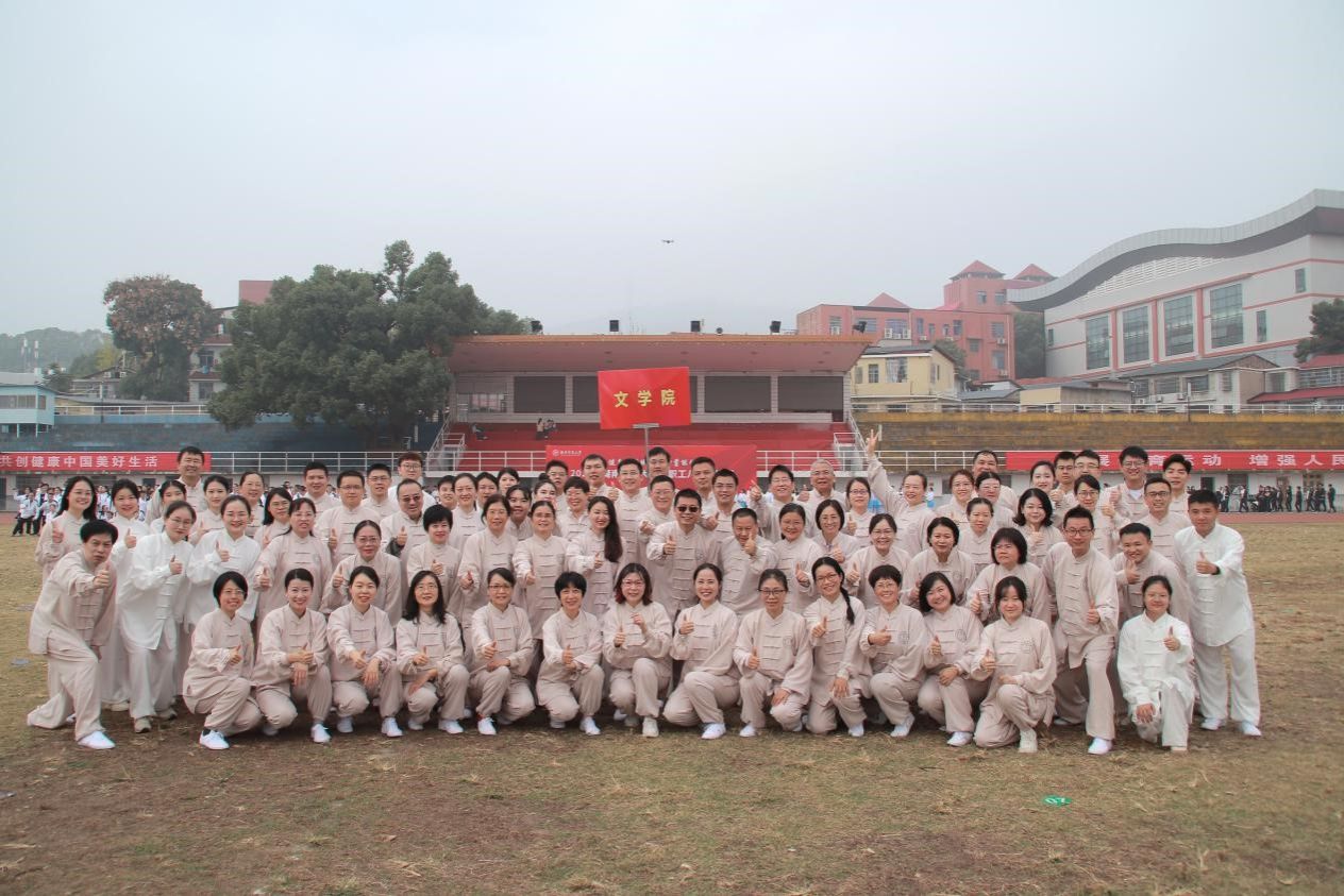 文学院参赛队伍阵容空前。肖百容院长、熊剑峰书记等6位院领导、73名教师代表参赛。比赛中,伴随着古朴悠扬的音乐,老师们动作自如、舒展大方、飘逸灵动,把八段锦的柔和圆滑、虚实相生、刚柔并济等特点演绎得淋漓尽致,展现了健身气功的独特神韵,赢得了评委与观众的一致好评,并获得了“最佳组织奖”、八段锦比赛“三等奖”两项殊荣。