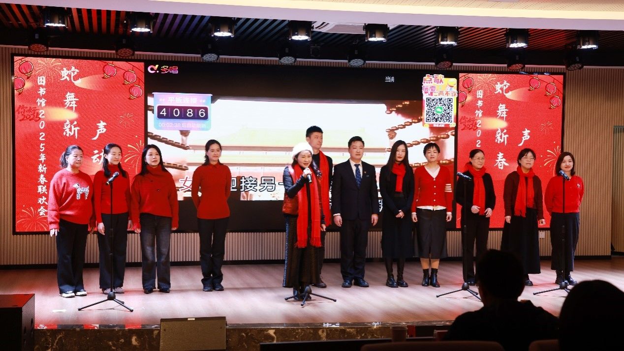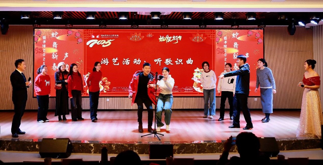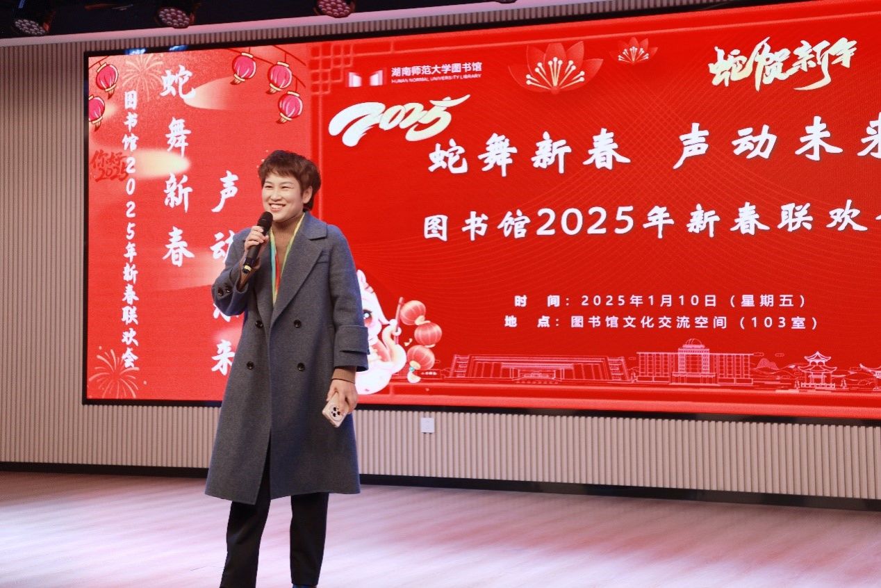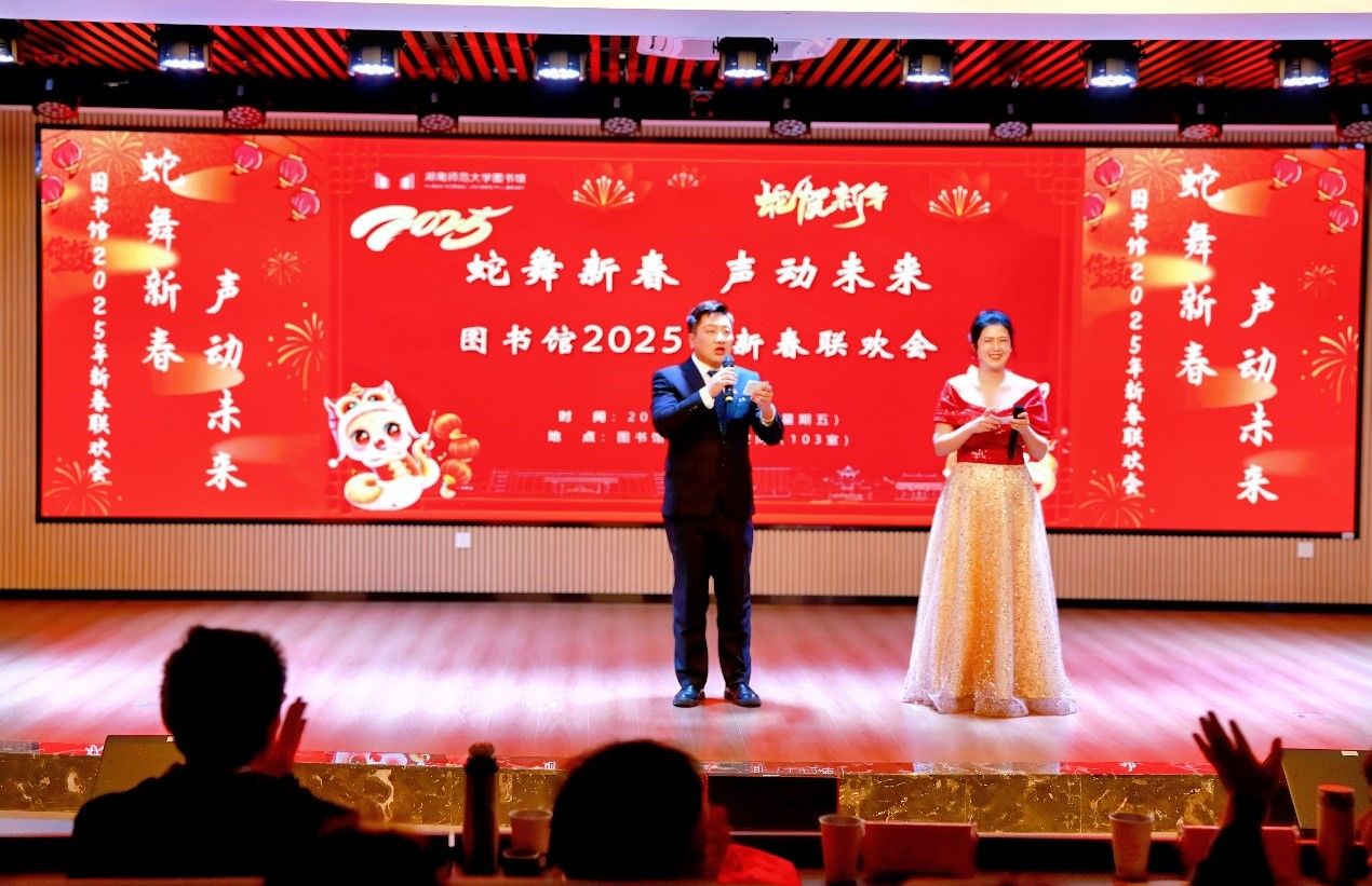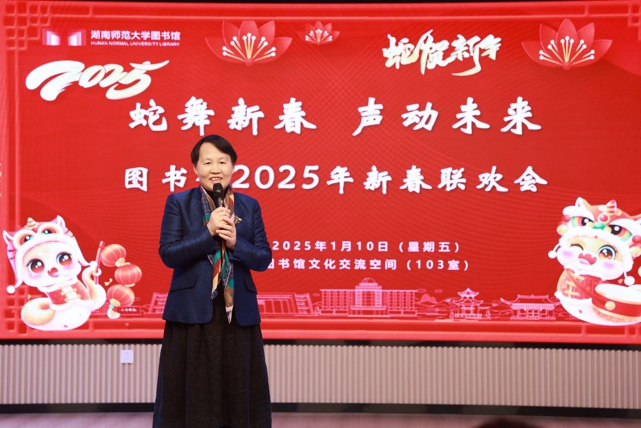 1月10日下午,WilliamHill体育在馆文化交流空间举行“蛇舞新春 声动未来”2025年新春联欢会。副校长谢资清、湖南省高师中心常务副主任罗晓慧莅临现场,与全体馆领导、全馆职工,欢聚一堂,共庆新春。联欢会由青年职工段超、刘奥粤主持。