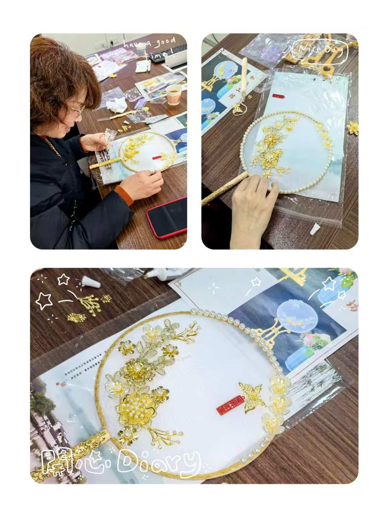 进入古风团扇DIY环节,学院工会已经准备好了各式材料,素白绢面团扇、花朵珍珠材料包、胶水工具、流苏配饰一应俱全,如画卷铺满了长桌。老师们可以选择自己喜欢的样式,参照图纸或者发挥创意,在团扇上拼贴出各式国风古韵的图案。有璀璨夺目的花朵、翩翩飞舞的蝴蝶,还有吉祥如意的图章。能够在快节奏的生活中静下心来,认真创作一把属于自己的团扇,既是对传统文化的致敬,也是对内心世界的梳理。