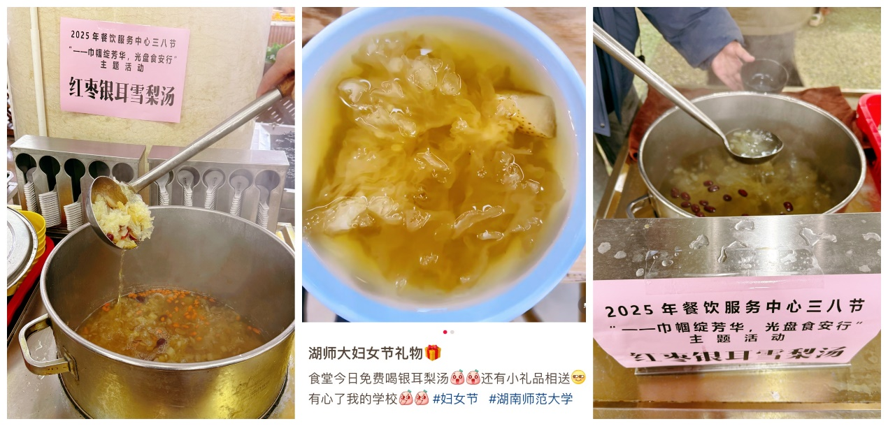 在这个特别的节日里,各食堂还特别推出了免费银耳红枣雪梨汤,为师生们送上一份温暖与关怀。香甜可口的汤品,不仅滋润了大家的味蕾,更温暖了每个人的心田。许多同学表示,在忙碌的学习生活中,能喝到这样一碗暖心汤品,倍感幸福。