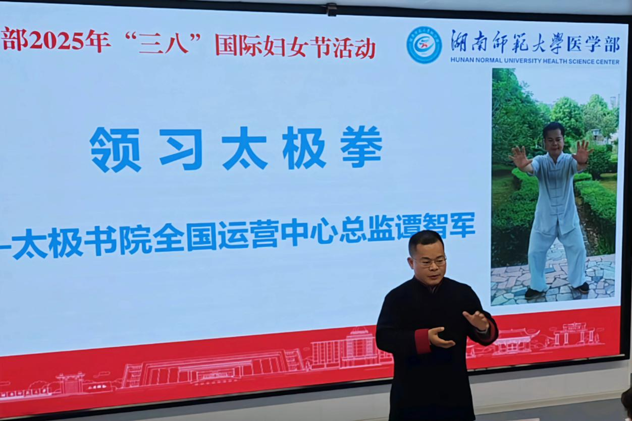 在“动静相宜”环节中,太极书院全国运营中心总监谭智军老师带领全体人员学习太极养生功法。通过“以意导气,以气运身”的招式教学,女教职工们亲身体验中医“形神共养”的实践精髓。松柔连贯的动作配合呼吸吐纳,生动诠释“动以养形,静以养神”的养生哲学,为缓解职业亚健康提供了有效方法。