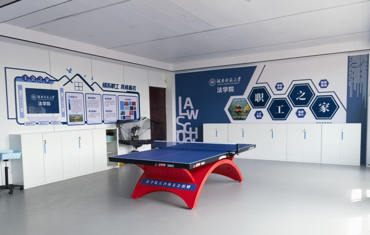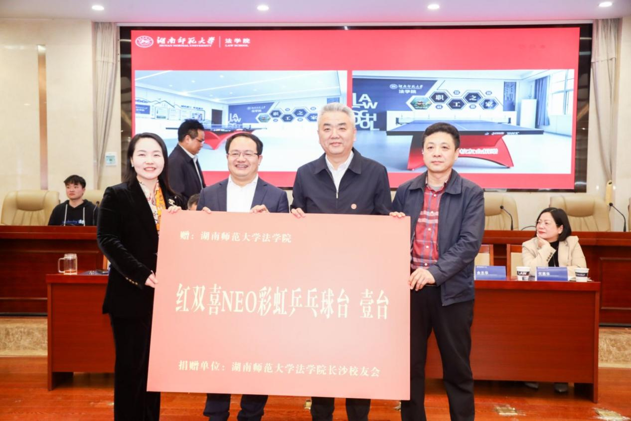 长沙校友会向法学院捐赠专业级红双喜乒乓球台,学院党委书记杜继军、部门工会主席耿自强代表学院接受捐赠。"这台球桌承载着校友对母校文体发展的支持,未来将成为师生强健体魄的新阵地。"耿自强在致辞中表示。据悉,该球桌将安置于学院新建的"职工之家",与读书吧、健身区共同构成教职工休闲空间矩阵。