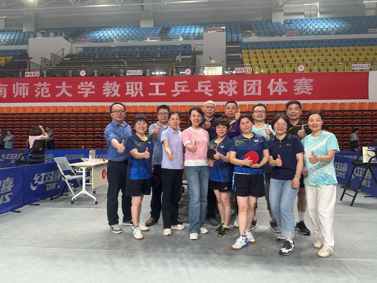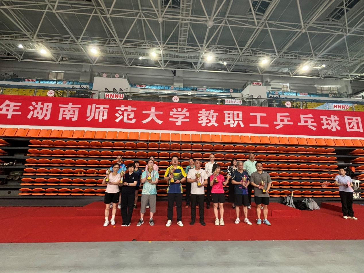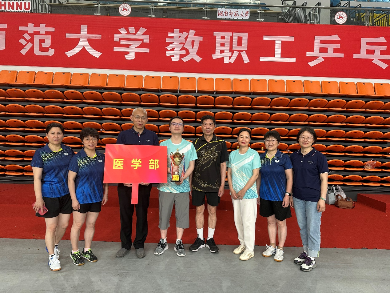 为贯彻落实全民健身国家战略,助力健康中国建设,不断提高教职工的身体素质和健康水平,为学校“双⼀流”建设汇聚⼒量。2025年湖南师范⼤学教职工乒乓球团体赛于5月8-9日在江湾体育馆举办。医学部党工委副书记鄢朝晖率队参加此次比赛。经过两天的激烈角逐,最终斩获季军,刷新了医学部乒乓球竞赛的历史最好成绩。